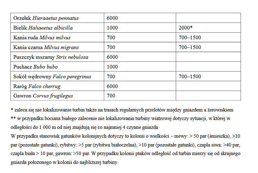 Zgodnie z treścią projektu opracowania zaproponowane poniżej odległości są rozwiązaniem kompromisowym, godzącym interesy inwestorów oraz konieczność ochrony ptaków. Gatunki, dla których je zaproponowano mają w rzeczywistości bardzo duże rewiry żerowiskowe (nawet do 20 kilometrów od gniazda) [LAG VSW 2015, LFU 2025]. Zaproponowane odległości chronią więc bezpośrednie otoczenie gniazda czyli obszar, w którym można spodziewać się najwyższego poziomu aktywności ptaków, a więc najwyższy poziom ekspozycji na kolizje. Odległości turbin od gniazd zaproponowane dla niektórych gatunków w opracowaniu GDOŚ dotyczącym oceny stanu zachowania siedlisk są znacznie większe i obejmują znaczne obszary rewirów żerowiskowych (Zawadzka i in. 2013). Ze względu na upływ czasu i postęp wiedzy jaki dokonał się od momentu opublikowania ww. pozycji dane dotyczące przedmiotowego zagadnienia należało skorygować.