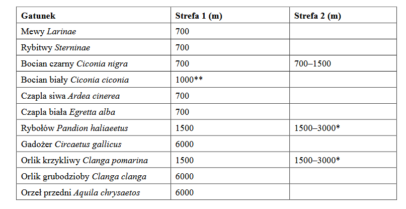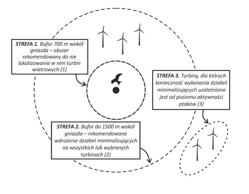 Minimalne rekomendowane odległości turbin od gniazd (lub granic wyznaczonych stref w przypadku braku wiedzy co do lokalizacji gniazda) (Strefa 1) oraz zakres odległości od gniazd, w której wskazane jest zastosowanie działań minimalizujących (Strefa 2).