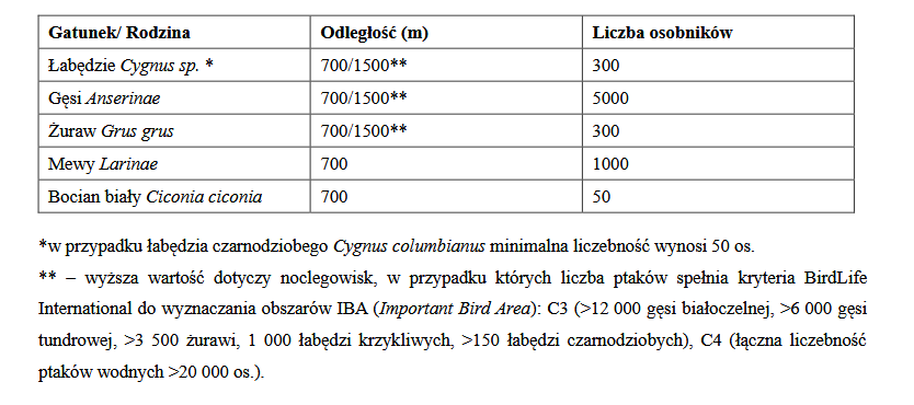 Krok 2 – Jeśli stwierdzono obecność noclegowisk spełniających kryteria opisane w tabeli poniżej, to należy ustalić, z których turbin wiatrowych należy zrezygnować lub ewentualnie zmienić ich położenie. Ze względu na wysokie prawdopodobieństwo znaczącego negatywnego oddziaływania na populacje kluczowych gatunków ptaków nie powinno się lokować turbin wiatrowych w określonych odległościach od noclegowisk. Odległości od noclegowisk wskazano w tabeli poniżej.