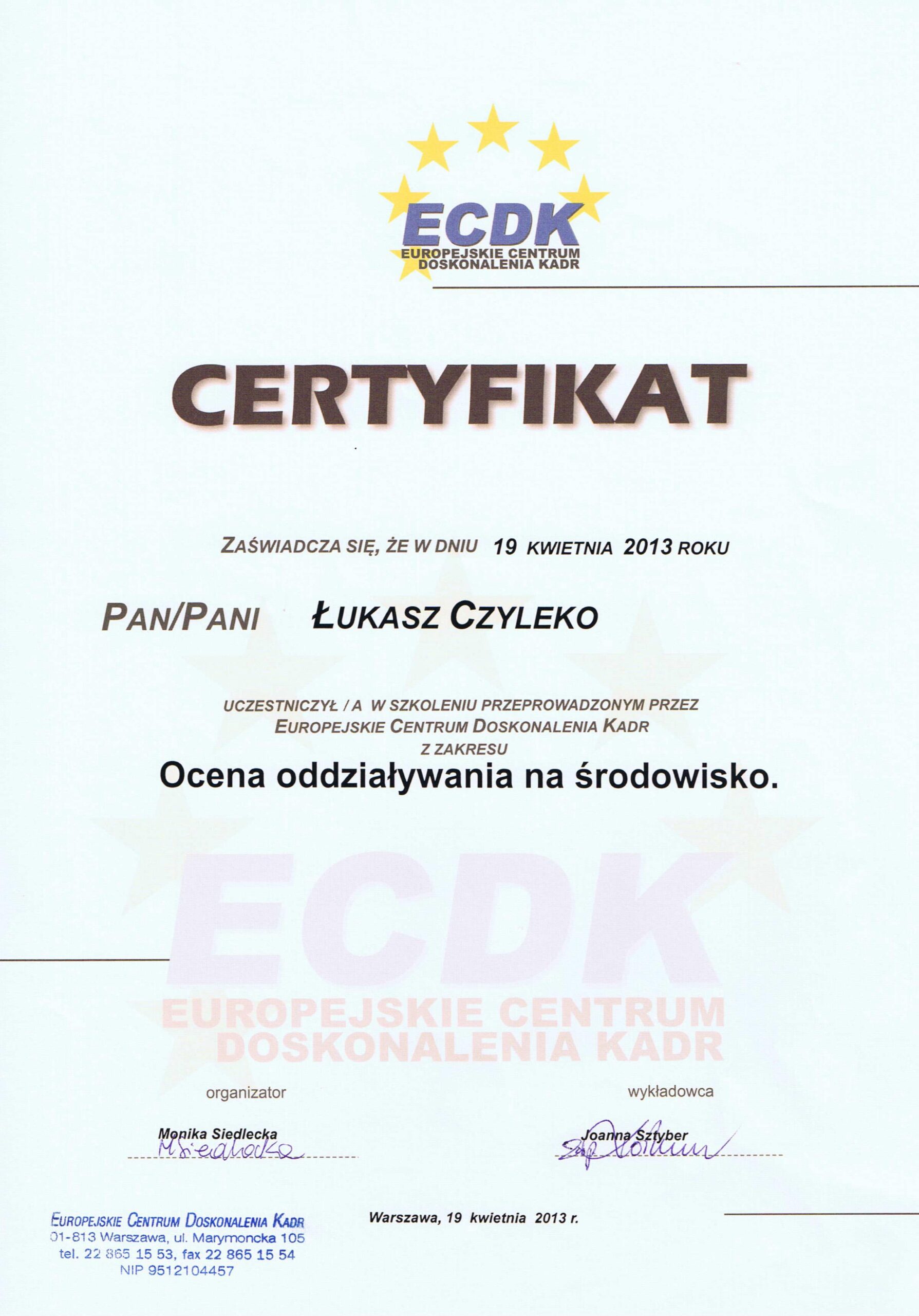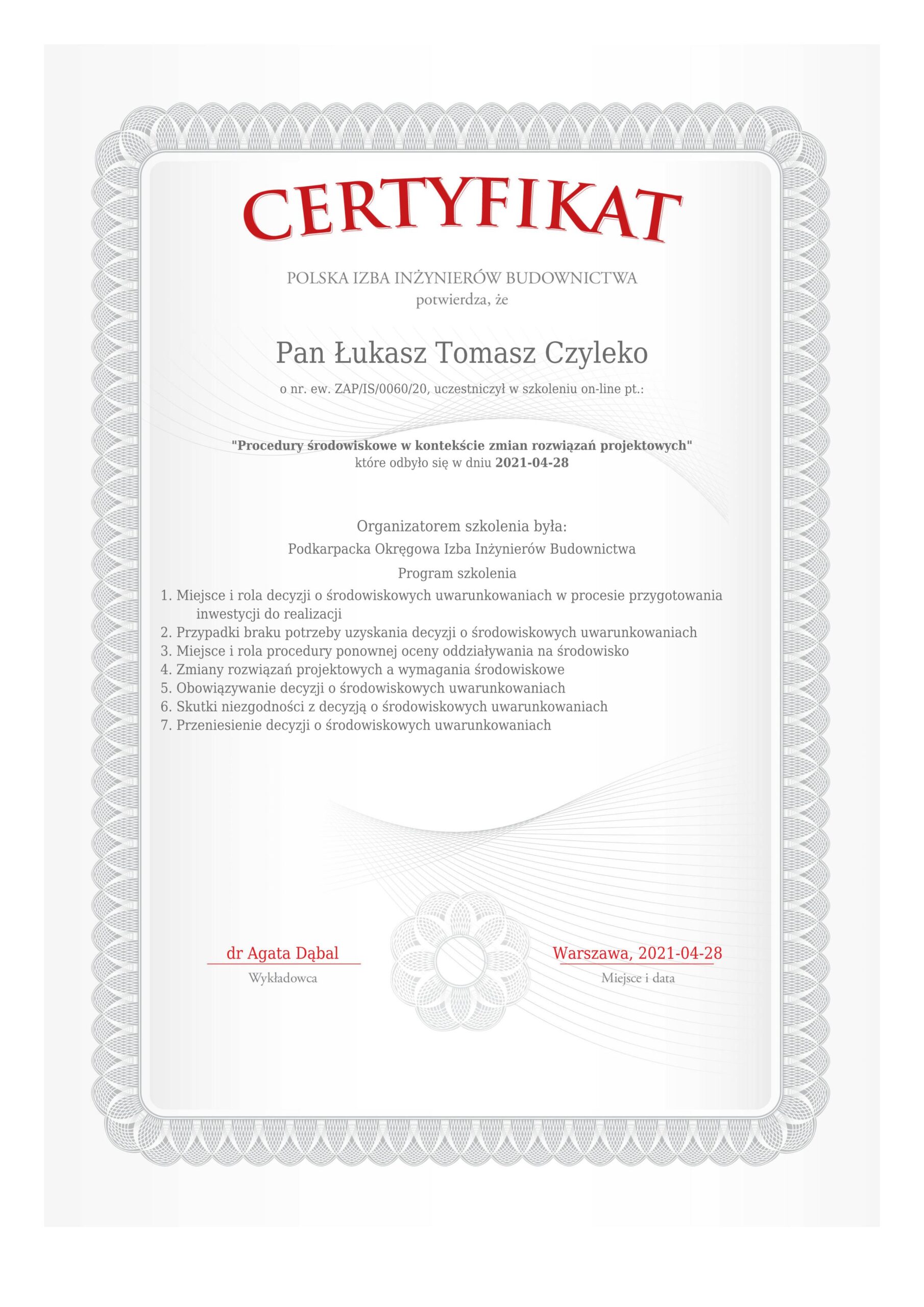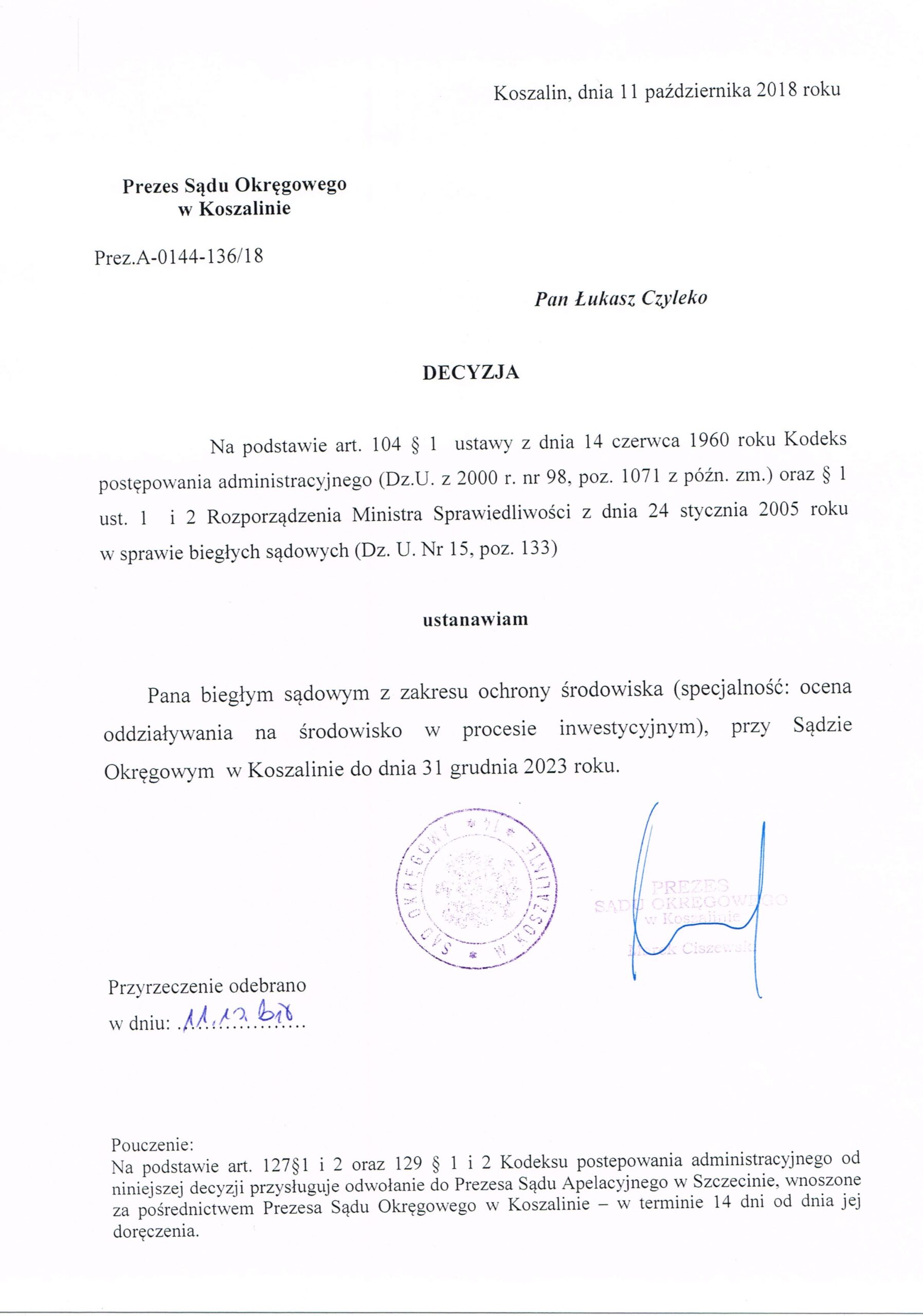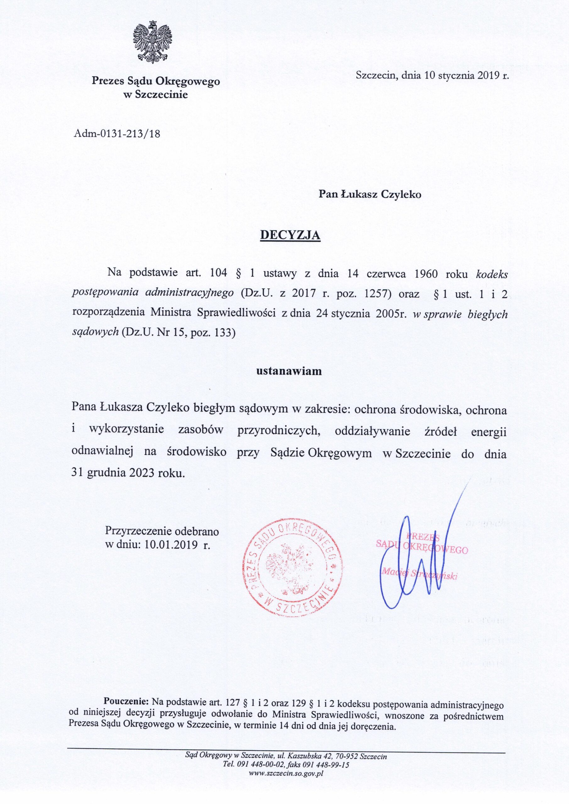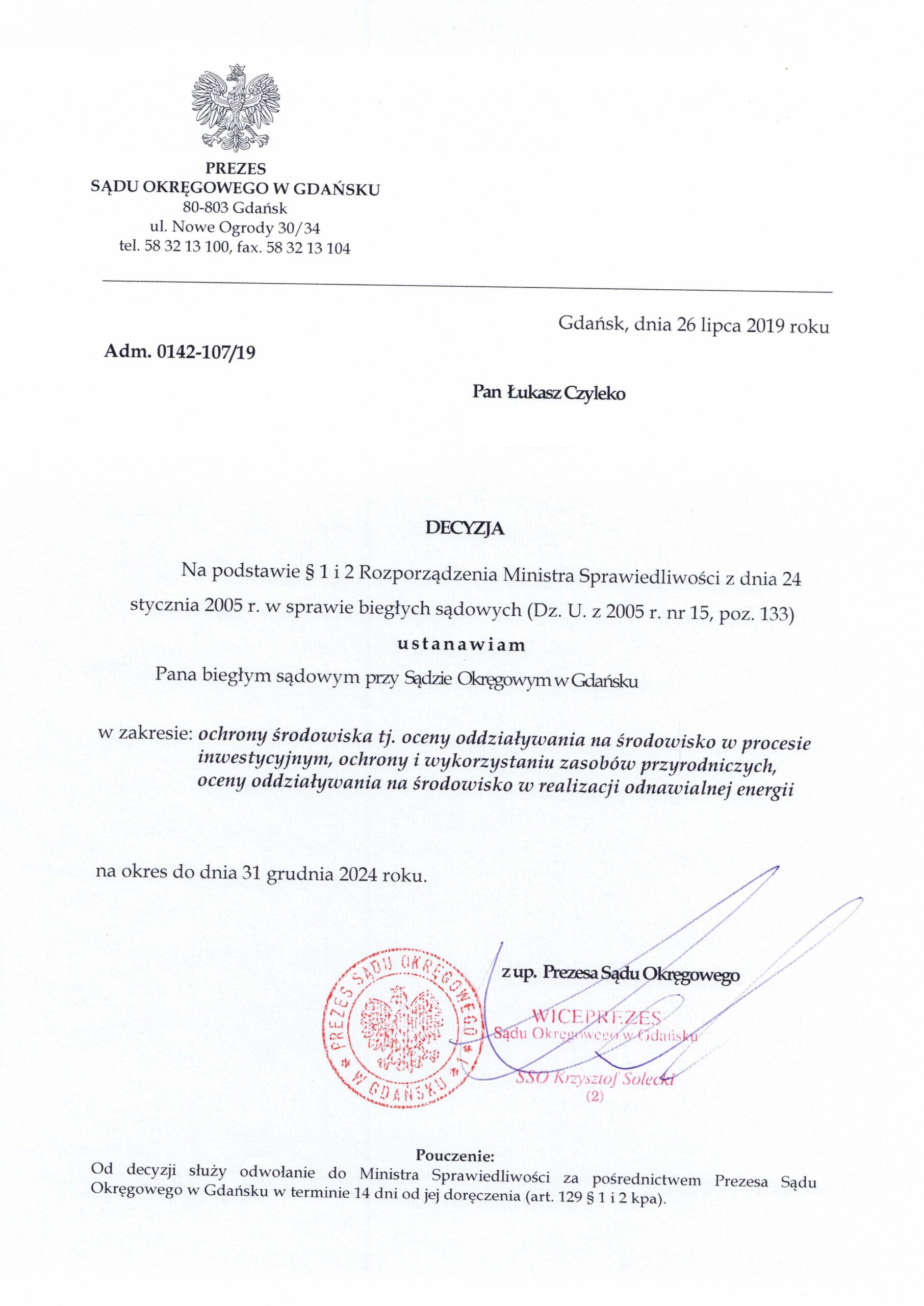 Biegły sądowy z zakresu ochrony środowiska i oceny oddziaływania na środowisko w procesie inwestycyjnym w Sądzie Okręgowym w Szczecinie, Koszalinie oraz Gdańsku.