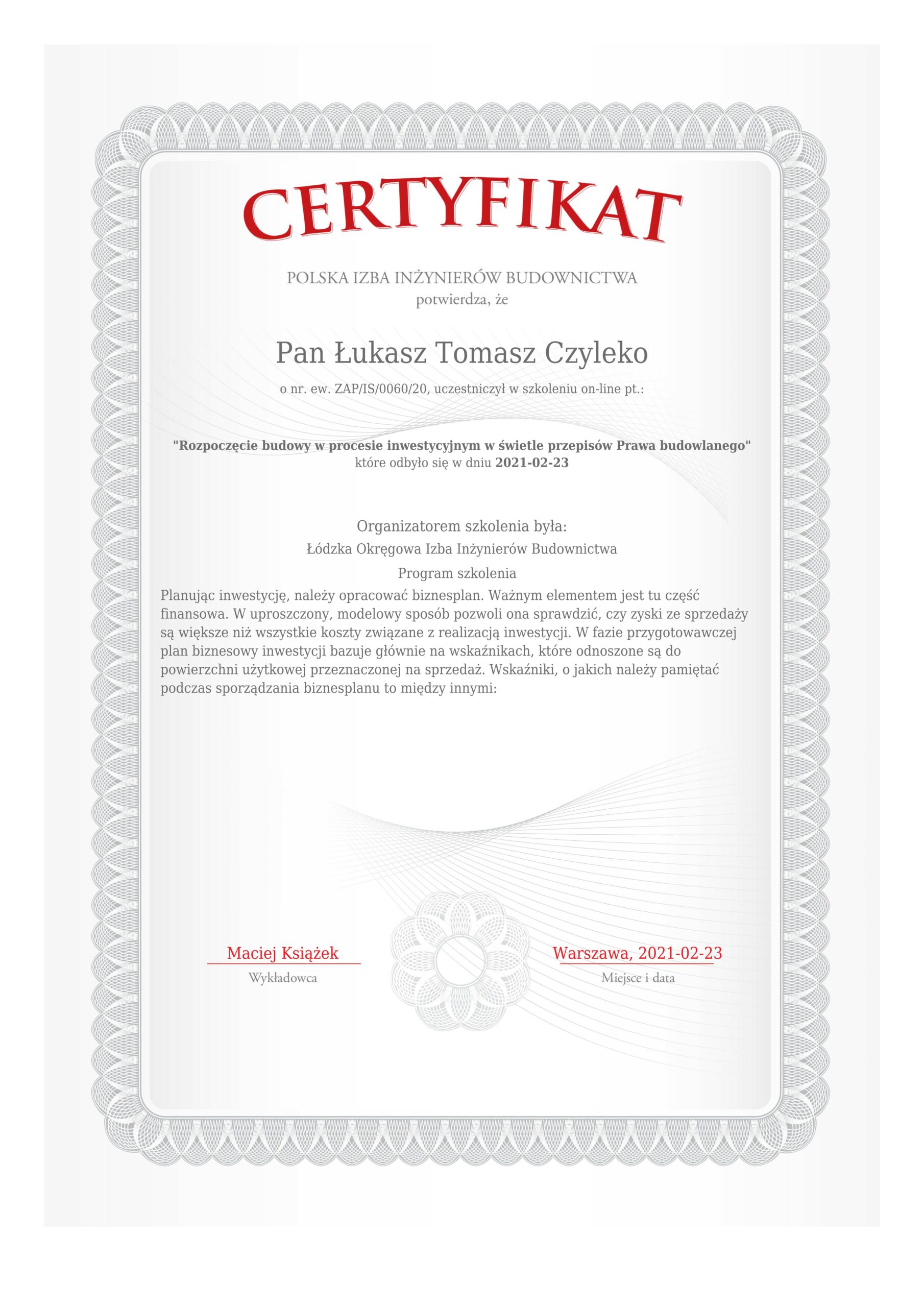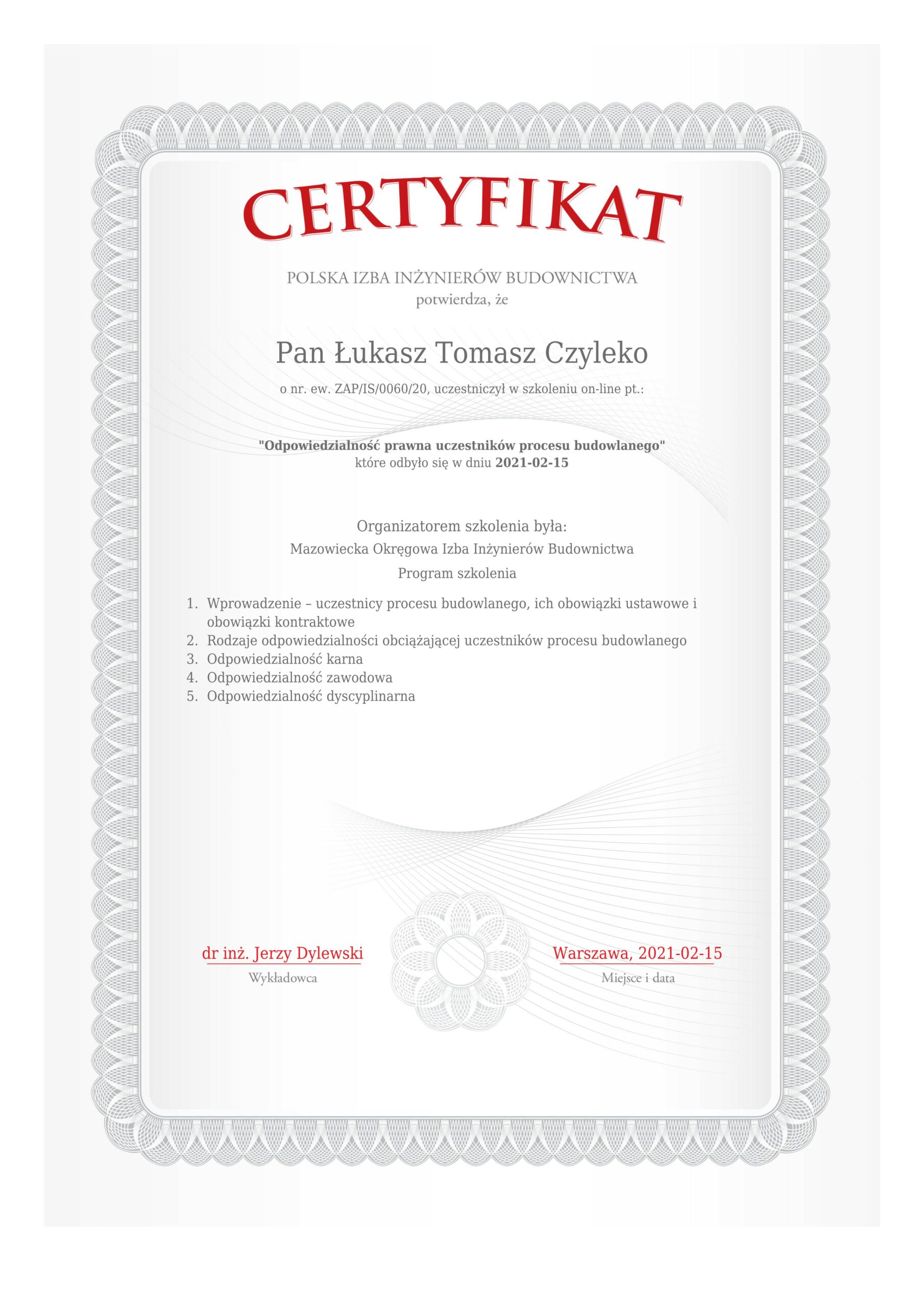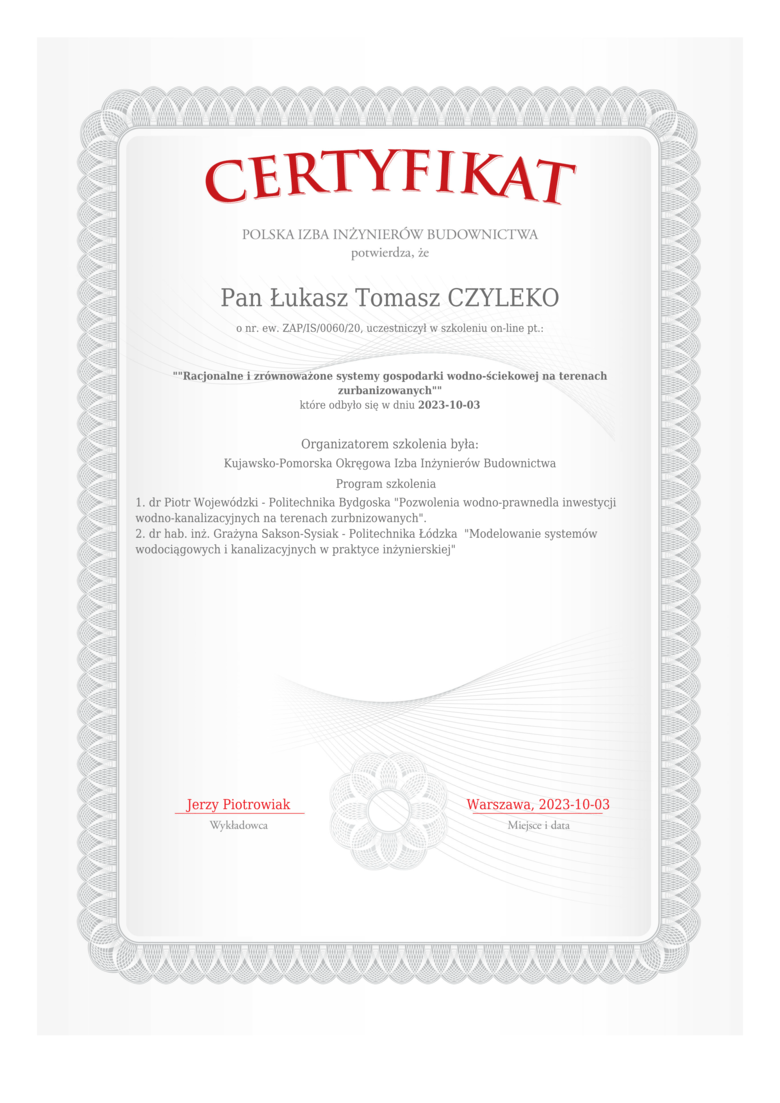 Posiada uprawniania budowlane nr ZAP/0226/WBS/19, ZAP/IS/0060/20, do kierowania robotami budowlanymi w specjalności instalacyjnej w zakresie sieci, instalacji i urządzeń cieplnych, wentylacyjnych, gazowych, wodociągowych i kanalizacyjnych bez ograniczeń.